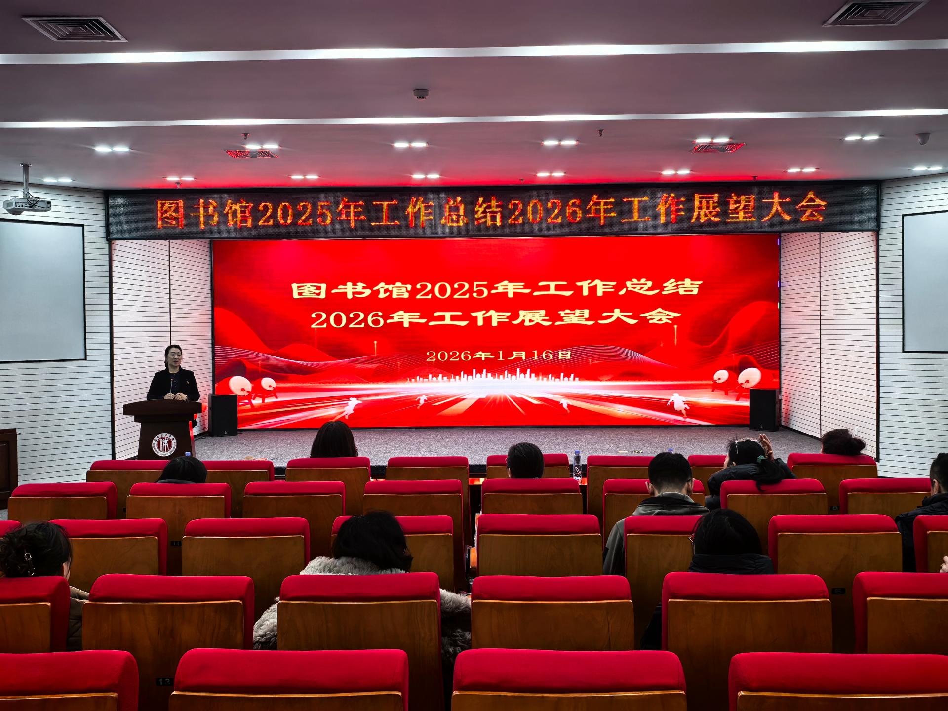 2026年1月16日,图书馆在二楼报告厅召开2025年工作总结暨2026年工作展望大会。会议由馆长庞宏娜主持,全体馆员参加。
